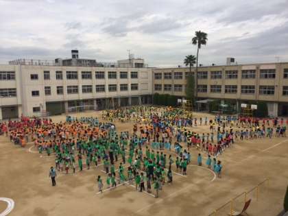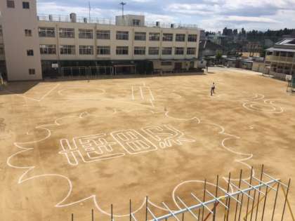 かねてからお知らせしていたように、本日全校児童、教職員で航空写真を撮影しました。業者の方が、朝早くから運動場に白線を引き、撮影に向けての準備を着々と進めていってくださいました。大勢が気持ちを合わせて一つのデザインを完成させます。10時から学年ごとに並び始め、ちょうどみんなのポジションが決まった10時25分頃に飛行機が飛んできました。南田辺小学校の上空を4周回って写真撮影してくれました。終わってから、みんなが飛行機に手を振ると、パイロットさんが機体を左右に揺らして「さようなら」という合図を送ってくれました。子どもたち一人一人の心にいい思い出となって残ってくれることでしょう。上記の写真は、デザインがはっきりしていませんが、本番は皆が一斉にカラーエプロンを自分の前に広げ、飛行機から撮影しているのでもっと図柄が浮き立っていると思います。お楽しみに。