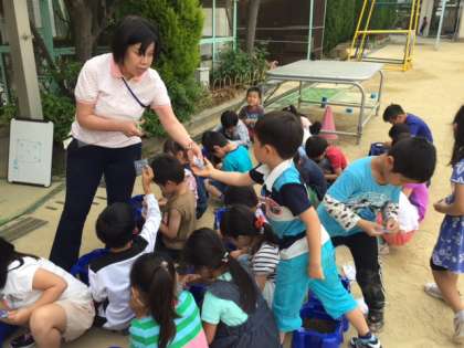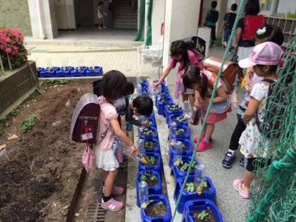 先週、1年生の子どもたちがアサガオの種まきをしていました。今週になって次々と芽を出し、植木鉢の中では元気な双葉が日に日に大きく育っています。朝、登校した子どもたちは、まずアサガオの水やりをしています。今週の月曜朝会の時、『植物に「早く大きくなってね」「きれいな花を咲かせてね」などと話しかけながら育てると、よく育つという話を聞きますね。本当かなと思って調べてみると、科学的に実験をしている人がいて、確かに影響があるらしいですよ。』という話をしました。各学年、種や、苗を植えて育てる学習をしています。育ちを観察するとともに、生命を育んでいると言う気持ちも大切にしてほしいと思っています。