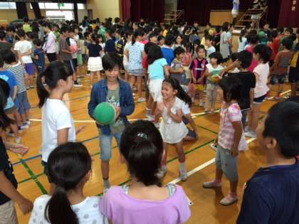 今日は全校児童集会でした。集会委員の子どもたちの司会で、「紹介ばくだんゲーム」をしました。いつものように縦割り班で円を作ります。そして、音楽が鳴っている間、右隣の人の名前を呼んでからばくだんに見立てたボールを回します。音楽が止まった時にボールを持っていた人は罰ゲームをしなければなりません。子どもたちはハラハラ、ドキドキ、でもニコニコしながら、ボールを回していました。