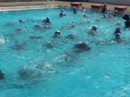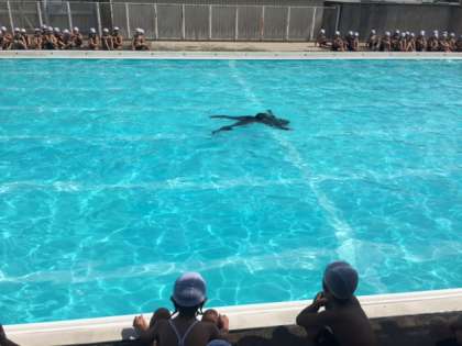 今日は朝からとても暑く、プールサイドの気温は32度、水温は30度で、絶好のプール日和です。1年生は今日で4回目の水遊びです。前の時間に輪くぐりをして、顔を水につけられるか一人一人確かめたそうです。今日は先生のお手本を見た後、大の字の形で浮いたり、だるまさんになって浮いたりする練習をしました。約130名の子どもたち、思わずお話してしまうこともありますが、しばらく待っていると先生の次の指示を静かに聞くことができています。プールから上がった子どもたちは思わず「ああ気持ちよかった」と嬉しそうでした。