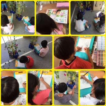 アサガオを見ながら、気づいた事を記入し、スケッチし、教室に戻り色塗りをしました☆☆☆