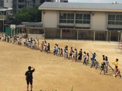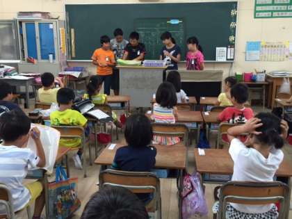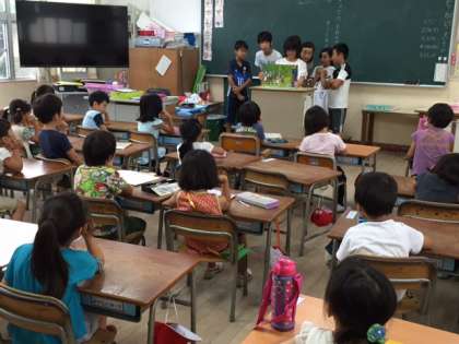 本校では毎年1年生が入学してしばらくの間は、6年生が給食や掃除を手伝いに行っています。今年度は、1学期の間、6年生が各クラスで考えた方法で1年生との交流を続けています。毎週水曜日の朝の会には6年生が1年生の教室を訪れ、「読み聞かせ」「クイズ」「折り紙」などをしています。作った紙飛行機を一緒に飛ばしているクラスもありました。