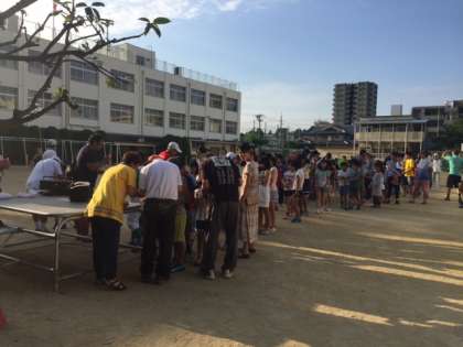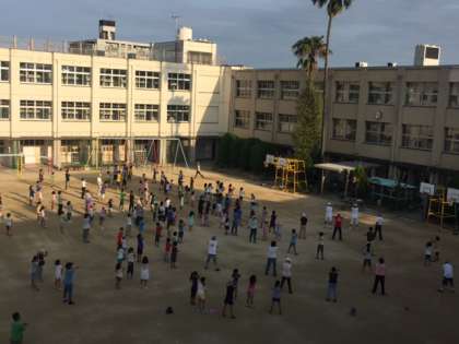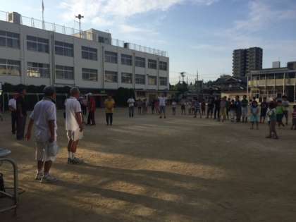 学校では、子どもたちの体力・運動能力向上に力を入れていることをご理解いただき、今年創立80周年という記念の年でもあるので、久々にラジオ体操を復活させますと、南田辺連合町会のスポーツ指導員さんから、お話をいただきました。どれくらいの子どもが参加するか心配していましたが、 6時15分頃に子どもたちが来始め、最終148名の参加がありました。