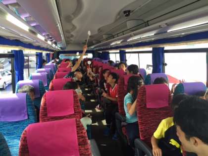 2号車では、阪神高速に入った途端、バスレク係の、丸ばつクイズが始まりました。8時55分兵庫県に、入りましたが、渋滞です。