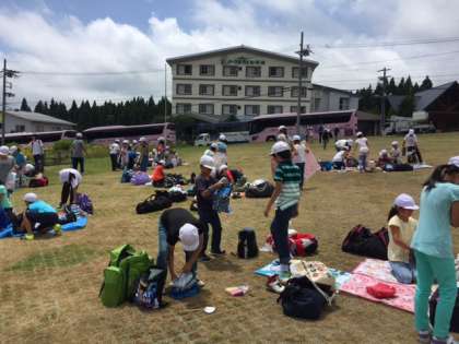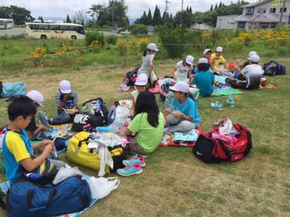 まずは、高原でお弁当です。朝からお家の方に作って頂いたお弁当を、自然に囲まれ頂いています。