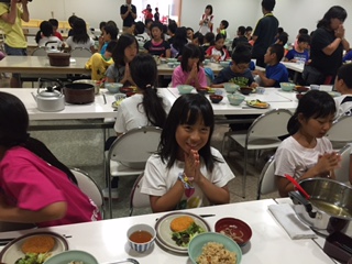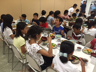 標高1221メートルの鉢伏山登山の後は、宿舎で昼食です。しっかり運動した後なのでお腹も空いたらしく、かやくご飯をおかわりしている子どもが多かったです。