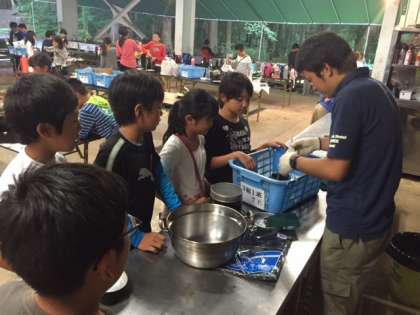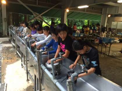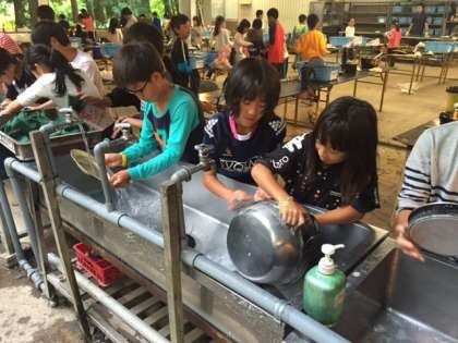 おいしく頂いたあとは、鍋、飯盒を洗います。宿舎の方の厳しいチェックがあるので、みんな一生懸命磨いています。「もとよりきれいにします。」と言いながら後片付けをしています。
