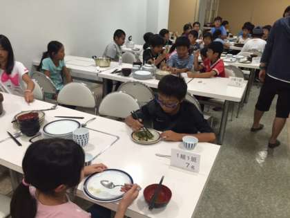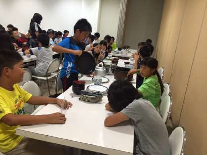 食事をいただいた後は、グループで食器を種類ごとに重ねます。これも、集団生活に欠かせないマナーです。