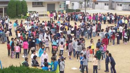 音楽が流れている間、ボールを班の中で回し、音楽が止まった時にボールを持っていた人がアウトになります。