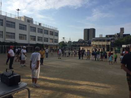 7月21日(木)より7月30日(土)までの10日間の予定で実施されたラジオ体操が終わりました。雨天のため1日中止になった日がありましたが、9日間で約1,700名が参加、1日平均約200名の子どもたち、保護者の方々、地域の方々の参加がありました。最終日には大勢の子どもが皆勤賞をもらえたそうです。後22日の夏休み、早寝早起きをして規則正しい生活を送ってほしいです。地域の皆様、PTAの皆様、早朝より子どもたちのためにお世話をしていただきありがとうございました。(写真は1日目の様子です)