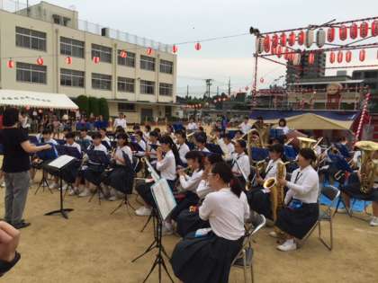 今日、明日は南田辺小学校の校庭で、南田辺まつりが開催されています。オープニングは、田辺中学校の吹奏楽部の演奏でした。先生たちのポップコーン、子どもたちのスマートボールも賑わっています。