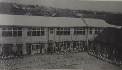 ○昭和11年10月1日 尋常科第4学年以下の児童、田辺校より732名、長池校より476名を分離し、18学級で「南田辺尋常小学校」が開校しました。上記写真左は開校時の木造2階建北校舎です。右は現在の北校舎です。