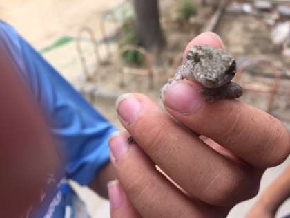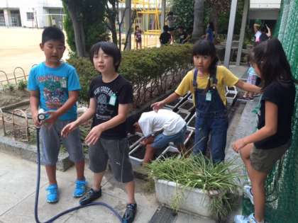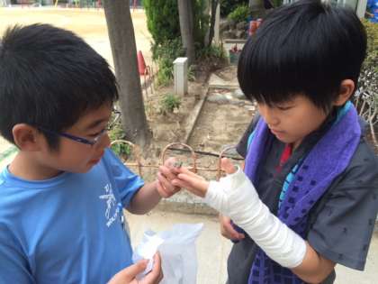 栽培委員会は、コスモスの種まきをしていました。活動中にヤモリを発見、周りの子どもたちは「意外とかわいい」と言っていました。