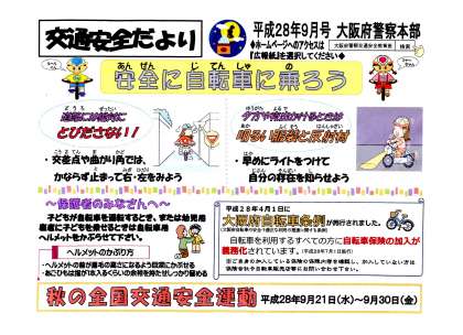 大阪府警察本部からの「交通安全だより 9月号」も配布文書に掲載しました。詳しくは→こちらをご覧ください。この三つの標語と、「交通安全だより」を参考にご家庭でも是非「自分の命は自分で守る」ことについて話し合ってください。