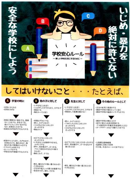 9月5日の記事でもお知らせしたように、先週の児童朝会では「しないといけないこと」「してはいけないこと」の話を子どもたちにしました。それに加え、2学期から各教室に下のようなポスターを掲示しています。大阪市教育委員会から配付されたものです。1〜4年の教室には「ともだち だいすき いじめない やさしいきもちで あかるいがっこう」5〜6年の教室には「なかまの笑顔を広げよう 勇気を出してみんなでいじめをなくそう」そして、全教室に「学校安心ルール」を掲示しています。どの子も毎朝笑顔で元気に登校して来ることができる南田辺小学校であるようこれからも教職員一同力を合わせてまいります。保護者のみなさまのご理解ご協力をよろしくお願いいたします。