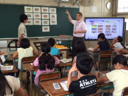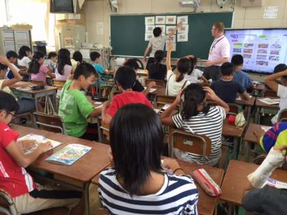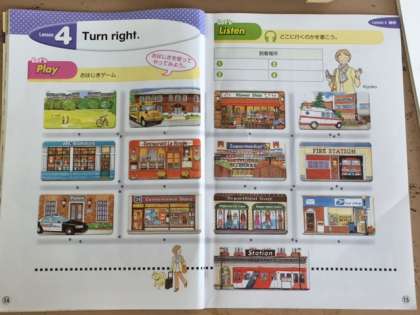 今日のC-NETは6年生でした。テーマは「Turn Right.」。「Fire Station 」「Department Store」「Convenience Store」などとLosh先生や、担任の先生が読み上げるのを聞き、自分のテキスト上の同じ建物を指差すという学習などをしました。