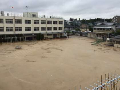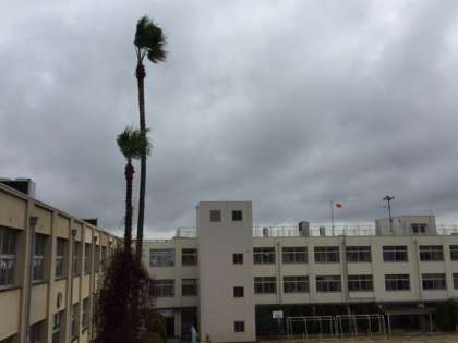 校庭のヤシの木の葉が強風に揺れています。ご家庭でも台風への備えをされていることと思いますが、学校でも運動場の防球ネットを倒したり、一旦設置したテントの足を畳んだり、校舎の窓の施錠を確認したりして台風に備えています。