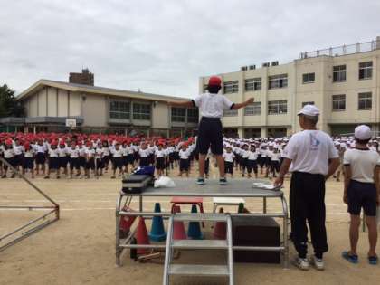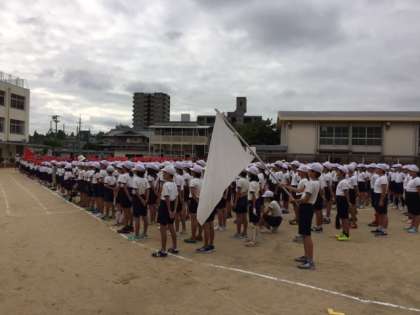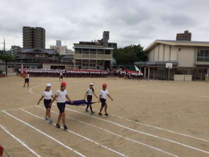 台風一過とはならず、曇り空の下、開会式の練習をしました。初めてなので1時間でどこまでできるか心配していました。でも、先生たちがトラックのライン引きや放送機材などの準備を協力して素早く行い、また、760名の子どもたちが先生の指示をよく聞き、しっかり動けたので入場行進から、開会式、閉会式の練習、さらに、3・4年生による石ころ拾いまでできました。さすが南田辺小学校の先生たち、そして子どもたちです。