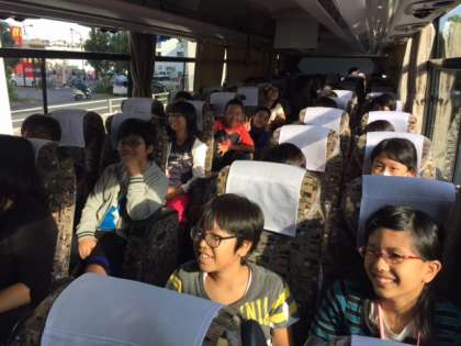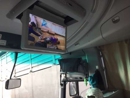 20人のバスレク係が、事前に作ったDVDを見ながら、みんな楽しく過ごしています。まもなく福住インターです。