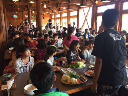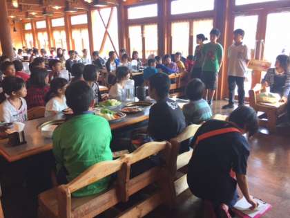 昼食は、バーベキューです。時計係が、これからのスケジュールをみんなに伝え、食事係を中心にみんなで、食事の歌を歌い「いただきます」をしました。子どもたちの活動の様子に、同席だった一般の方々から、拍手が湧きました。