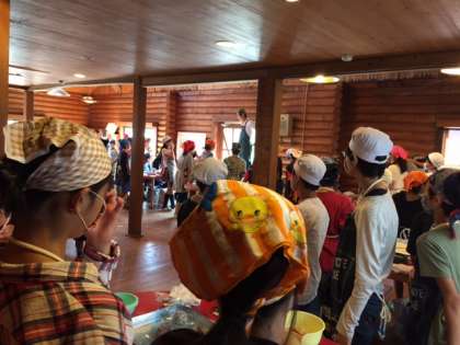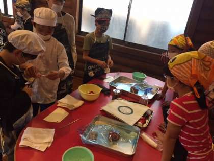 次はウインナー作りです。担当の方から、「南田辺小学校の子どもたちは素晴らしいね。5分で身支度や、手洗いの準備ができたね。お昼ご飯の様子も見てたけど、みんな、きびきび動いていたし、今もちゃんと話を聞いてるし。」と褒めていただきました。