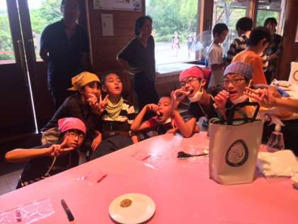 出来立てを1本ずつ試食させてもらいました。やはり、自分たちで作った上に、出来立てのウインナーの味は格別だったようです。先ほどモクモクファームを後にし、志摩マリンランドに向かっています。