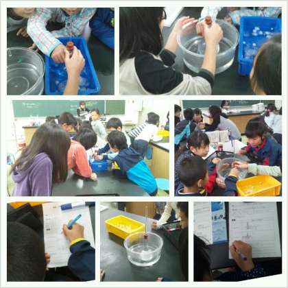フラスコに水を入れ、お湯に浸けた時と氷水に浸けた時の水のカサの変化を調べました☆☆☆