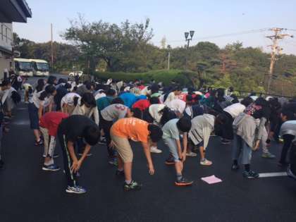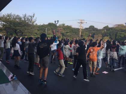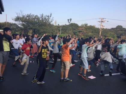 ラジオ体操が、まもなく終わろうとする頃、突然音楽が止まり、子どもたちの中にどうする?と言う雰囲気が漂いました。しかし、次に聞こえてくる曲が、運動会の団体演技の曲と分かるや否や、みな一斉に踊り出し、最後のキメのポーズが決まると、また、ラジオ体操の続きの曲が流れました。どの子も何事もなかったかのように、ラジオ体操を最後まで終えました。保健係の子どもたちのアイディアだそうです。