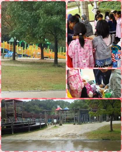 先ほどまで子ども達が楽しく遊んでいた遊具も雨の中さみしそうにしていました・・・(-"-)