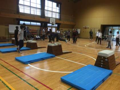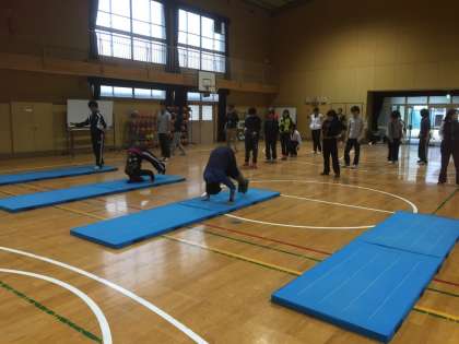 昨日の放課後、子どもたちの指導もしていただいている中央体育館の先生による実技研修会を実施しました。各先生たちは実際に自分自身もマット運動やとび箱運動、鉄棒運動に取り組む中で、子どもたちに指導する際のポイントを学びました。