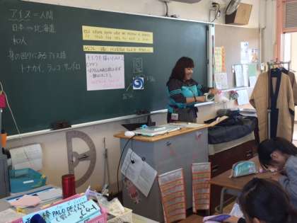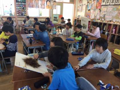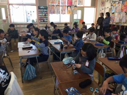 4年生で「いろいろな国の文化にふれよう」という学習をしました。この学習では、“みんぱっく”といって万博公園にある国立民族博物館が貸し出しをしてくれる「子どもたちのための、持ち運びできる小さな博物館」を活用しました。「アンデスの玉手箱」「アイヌ文化に出会う」「アラビアンナイトの世界」「極北を生きる」という学習をしますが、今日はその中の「アイヌ文化に出会う」と言う学習でした。CDを聞いたり、アイヌの民族衣装を着たり、アイヌ文様を色紙で作ったり、クイズに答えたりとバラエティーに富んだ活動を通して同じ日本にも様々な文化があることを知り、自分たちとの違いや共通点を考えることができました。
