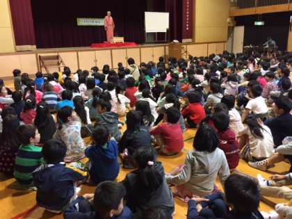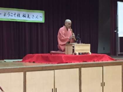 高学年の部では、落語「平林」を子どもたちも楽しめるようにアレンジして演じてくださいました。音楽療法もされているということで、ナポリ民謡「オー・ソレ・ミオ」を歌ったり、リコーダーでご自身が作曲された平和を願う「ほたる」という曲を演奏したりしてくださいました。