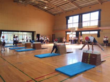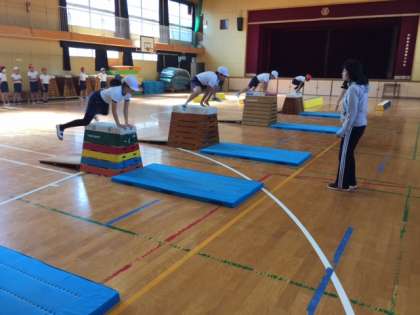 5年生の各クラスがゲストティチャーによる跳び箱の学習をしました。準備運動の後、全員で協力して準備しました。その後、自分の目標に合った跳び箱を選び、どんどん練習しました。開脚跳び、閉脚跳び、台上前転のそれぞれのポイントを教えていただき、練習を重ねるうちに、今までよりうまくなっているという実感からか子どもたちの顔はだんだんにこやかになっていました。子どもたちに尋ねると、「今までより跳び箱が跳びやすくなった。」「指示が具体的でわかりやすかった。」「準備運動や整理体操でのバランス運動が楽しかった。」「今日は挑戦しなかったけど、次は台上前転もやってみたい」という感想を述べていました。階段で、一緒になった5年生が「校長先生、今まで3段しか跳べなかったのに5段も跳べるようになりました。」と笑顔で報告してくれました。