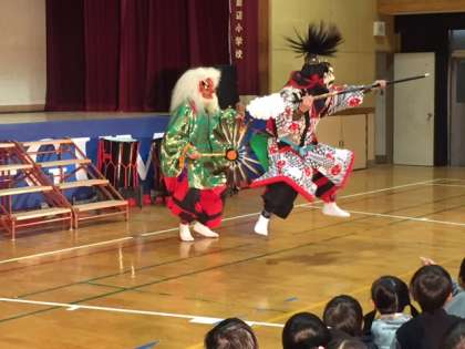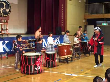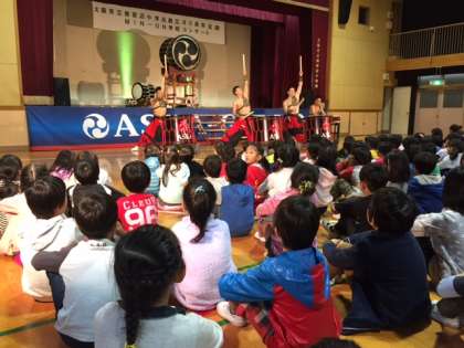 「舞太鼓あすか組」は飛鳥大五郎さんが1990年に創設された和太鼓集団です。「世界中どこに行ってもある楽器は太鼓です。みなさんは21世紀の人です。この中に必ず10年後、20年後には日本や世界で活躍する人がいます。みなさんにはエネルギーがいっぱいあります。学校の勉強はもちろん大事です。でも、そのほかにも趣味を持っていろいろな人と関わって元気で思いやりのある人になってください。」と子どもたちにメッセージを送ってくださいました。途中、鬼と天狗のせりふのないやりとりがあったのですが、さすがに南田辺小学校の子どもたちです。低学年の子どもたちも内容をしっかり理解して二人に声援を送っていました。