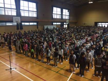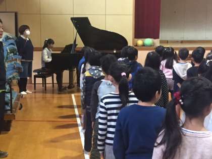今日の児童朝会では、11月25日(金)の2・3時限目に実施する「創立80周年記念交歓音楽会」で全校合唱する「まっかな秋」を練習しました。当日は4〜6年生が平素の音楽の授業の一環として各学級・各学年がめあてを持って取り組んだ曲を演奏し、1〜3年生はそれを鑑賞させてもらいます。「4年生になったら、あんなふうに演奏できる」と低学年の子どもたちは先輩たちに憧れます。先輩たちは後輩たちに自分たちの演奏を聞かせてあげることにやりがいを感じ、さらに、一緒に演奏する友だちとの絆を深めます。南田辺小学校のよき伝統の一つです。