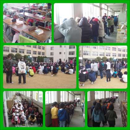 地震発生の放送後、机の下にもぐり、揺れが収まった後、運動場に避難し、整列、人員確認をしました。