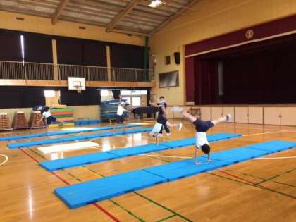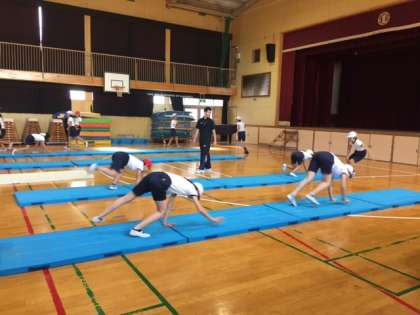 以前にもお知らせしたように、「体力・運動能力の向上」をめざし、2学期より各クラス2時間ずつ中央体育館の方に先生として来ていただき「マット運動」「跳び箱運動」の指導をしていただいています。今日は6年生4クラスが側転を中心に教えていただきました。明後日は跳び箱の跳び方を学習する予定です。「中学校、高校へ行っても体育ではマット運動があります。前転、後転、側転がかっこよくできるようにコツを覚えておいてね。」と手の付き方、着地の仕方など丁寧にわかりやすく教えていただきました。