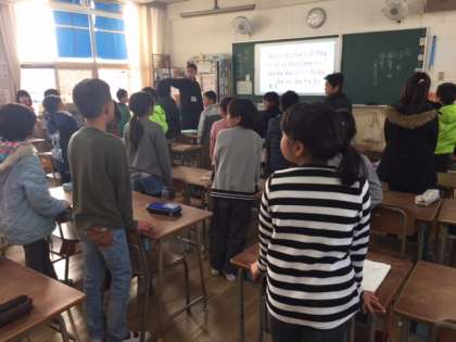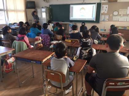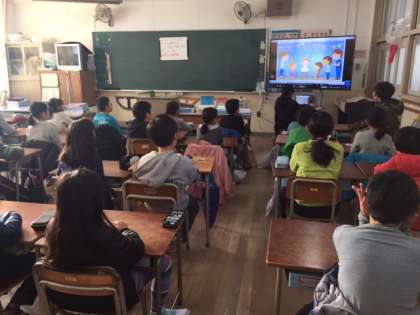 毎週水曜日の朝は全校英語モジュールの時間です。子どもたちもずいぶん慣れ、担任の先生がDVDをスタートするとそれに合わせてアルファベットの発音をしたり、簡単な会話を真似したりします。