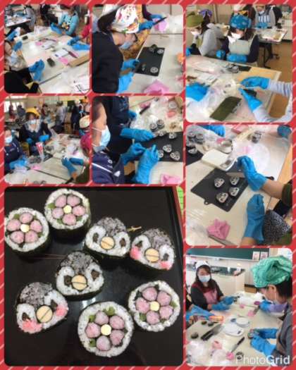 ご飯に桜でんぶや、黒ゴマで色を付け、小さいパーツを作り、のりを巻き、形を整え・・・包丁でカットすると可愛い絵柄になっているのを見ると歓声があがっていました☆☆☆