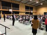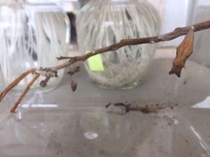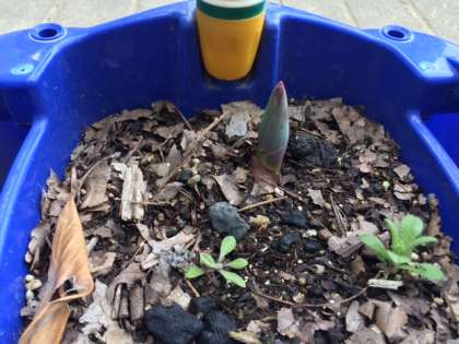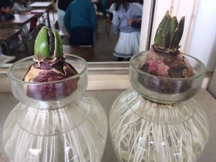1年生の教室の前では、水栽培のヒヤシンスがしっかりとした芽を出しています。運動場においている子どもたちの植木鉢の中では、チューリップの芽が伸びています。そして、1年1組の靴箱の上ではさなぎの姿で冬越しをしているアゲハチョウがじっと春を待っています。「ヒヤシンスやチューリップが咲いたり、アゲハのさなぎが蝶になったりするのとみんなが2年生になるのとどちらが早いかなぁ」というと、1年生たちは「うふふ」と笑っていました。