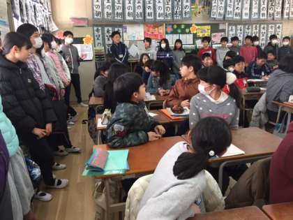 12月9日の記事でもお知らせしたように、6年生は国語科「町の幸福論」の学習をもとに自分たちの住む町の課題を見つけ、その解決策を考え提案するという学習をしています。パソコンを使い、みんなにわかりやすく自分たちの提案を伝えるという目標もあります。今日は、3組の子ともたちの発表を聞いて、先に学習を進めている6年1組の子どもたちが、アドバイスをし、さらにわかりやすいプレゼンテーションにしていくという学習をしていました。1組の子どもたちは、すでに作った経験を生かし、「アニメーションを使い過ぎで見にくかった」「文字の大きさを揃えた方が見やすい」「話している内容と同じことが文字になっていたので、画面の文字は減らした方がいい」「グループごとに背景はそろえたほうがいい」など、具体的なアドバイスがなされていました。