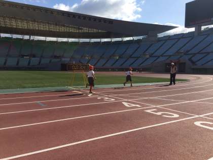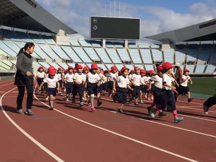 1年生、スタート。競技場内2周です。みんな無事ゴールインしました。