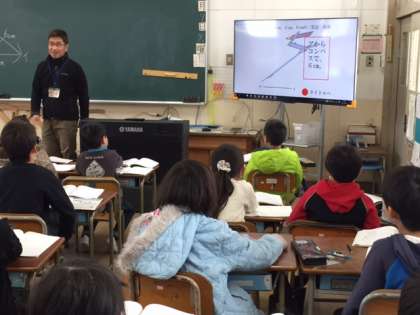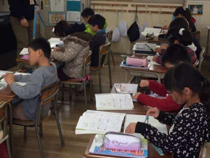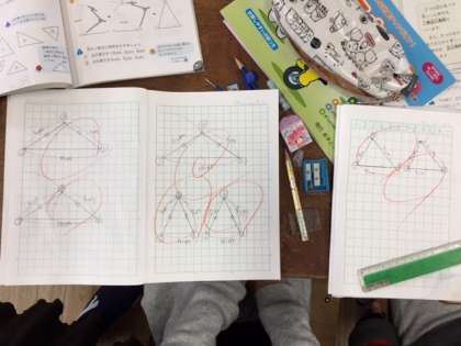 3年生が、コンパスと定規を使って二等辺三角形をかく方法を学びました。自分も、隣の友だちもかけたら先生に見てもらうというルールで、いくつもの二等辺三角形を作図していた子どもたち。何度も練習することでだんだん速く、上手にかけるようになってきました。担任の先生に合格の〇をもらった子どもたちは、嬉しそうに席に戻っていきました。最後に、二等辺三角形のかき方をみんなで映像で確認し、今日の勉強のまとめをしました。
