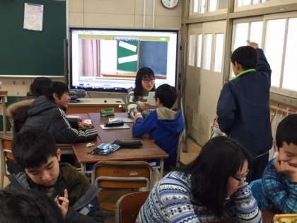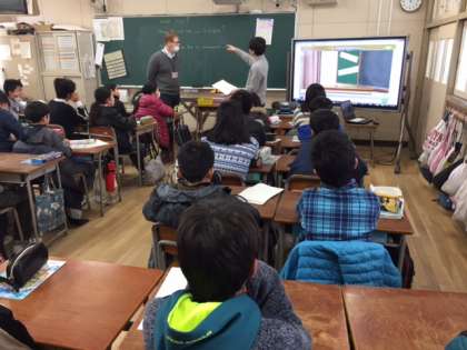 6年生が、C-NETのメイソン先生と英語劇の台本作りの学習をしていました。子どもたちは、メイソン先生に