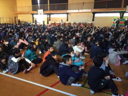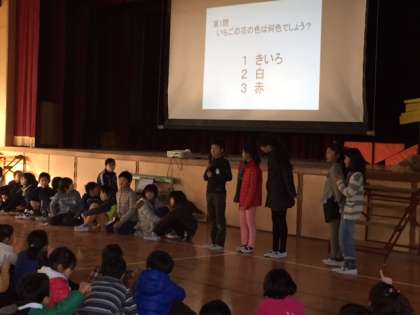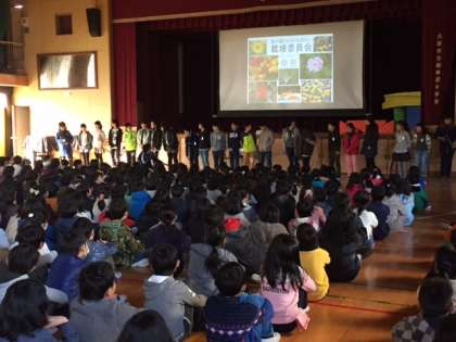 今日の児童集会は栽培委員会の発表でした。1年間に栽培した花や野菜の紹介をしたり、植物に関するクイズをしたりしてくれました。チューリップ、サルビア、パンジー、ひまわり、コスモス、田辺大根、なすなど多くの花や野菜を栽培したようです。クイズでは、栽培委員の子どもが「いちごの花の色は何色でしょう?」「1.きいろ 2.白 3.赤」と問うと、他の子どもたちは指で1.2.3を示し、正解が発表されるのを待ちます。「正解は2の白です」と言うのを聞いて「やったー」「イエーイ」と喜ぶ子、「あーあ」とがっかりする子。約750人の子どもたちが一堂に会し同じ時間を過ごします。
