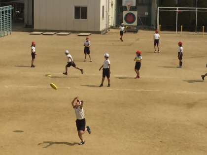 今年度の校長経営戦略支援予算—加算配付—で購入した体育用品の一つドッヂビーを使って4年生が体育の学習をしていました。ドッヂボールは球体ですが、ドッヂビーは円盤状なのでバランスえお取るのが難しいです。ドッヂビーの動きに合わせてバランス感覚、投げる力を養います。