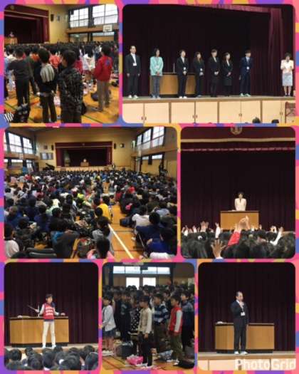 本年度第1回目の土曜授業として、「平成29年度 第1学期始業式」を実施しました。新しく転任してきた教職員の紹介の後、今年度本校で勤務する42名の教職員を紹介しました。その後は校歌斉唱です。新6年生の代表がいつものように前に出て、全校児童にメッセージを送った後、堂々と指揮をしてくれました。伝統が受け継がれています。