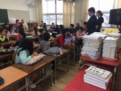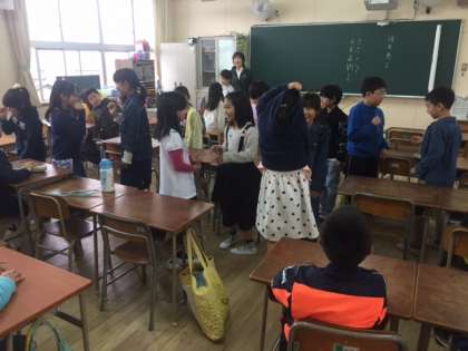 自分のクラスがわかったら、教室に入りました。先生の話を聞いたり、教科書やたくさんの手紙をもらったり、友だちとなかよくなるために、じゃんけんゲームをしたりしていました。