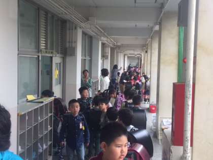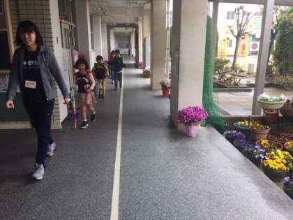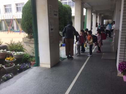 1年生は今日から14日まで「コアラ」「パンダ」「イヌ」「ネコ」「ペンギン」コースに分かれ、教師が引率しての下校をします。1日目なので下校準備に時間がかかります。