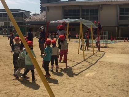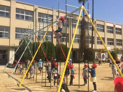 1年生は先生に見守られながら、うんていや、登り棒、ジャングルジムなどの遊具を使って遊んでいました。